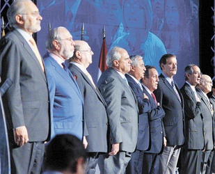 Vinicio Cerezo, Ernesto Samper, Nicolás Ardito, Hipólito Mejía, Álvaro Arzú (Alcalde de Guatemala y expresidente) y funcionario del municipio guatemalteco. 2da. fila: Álvaro Colom, Carlos de Mesa y Vicente Fox.
